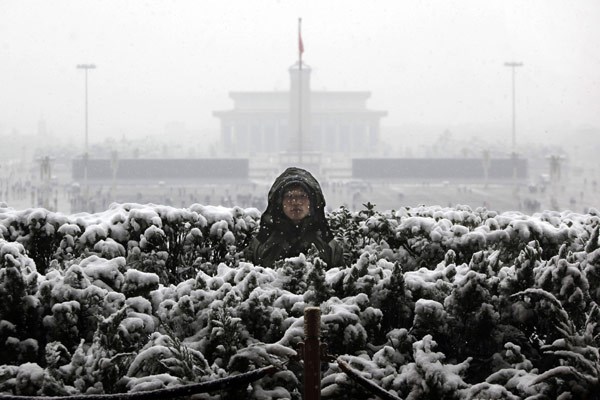 Um militar está de guarda ao portão de Tiananmen, no meio de um dos maiores nevões que já se abaterem sobre Pequim. A China recebe o Presidente Barack Obama e na mesa das negociações estarão as alterações climáticas.
